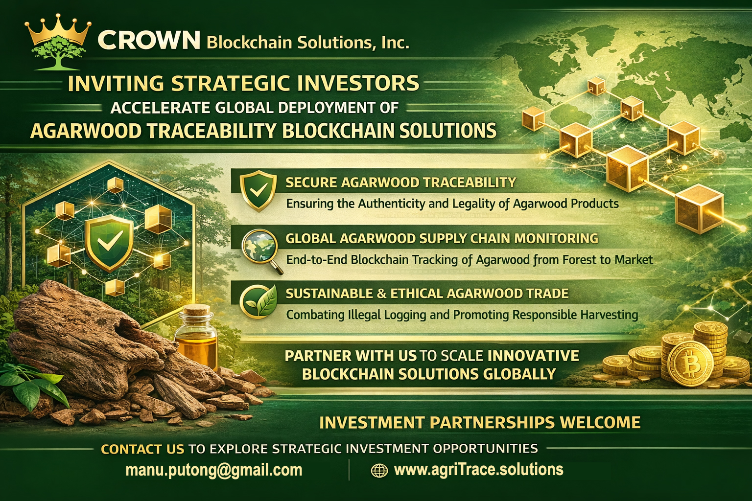 Crown Blockchain Solutions, Inc. — a pioneering technology venture at the intersection of blockchain innovation and sustainable luxury agriculture — today announced an open call for strategic investors to support the accelerated global deployment of its Agarwood Traceability Blockchain Platform. This cutting-edge solution is designed to transform transparency, supply chain integrity, and market confidence across the high-value agarwood industry.